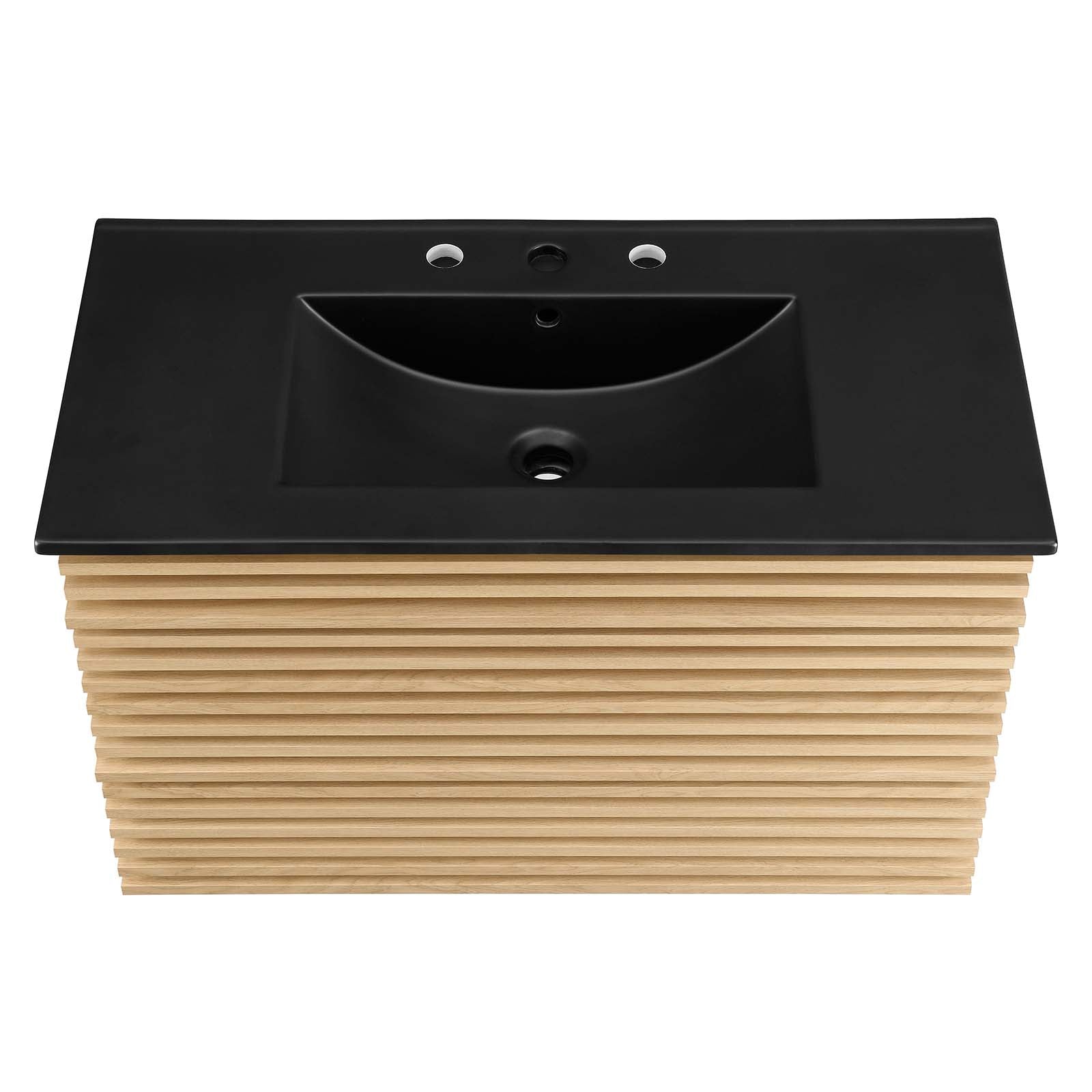Tap into mid-century aesthetics with the Render Vanity. The Render 36" Bathroom Vanity features a durable MDF and particleboard frame with smooth walnut grain laminate, ample storage space in two full-extension drawers, and a space-saving wall-mount design. Crafted with ceramic, a single sink with an integrated countertop, 8" centerset faucet holes, and rectangular sink basin continues the sleek look of this retro modern vanity. Clean lines and crisp design align for an edgy style designed to meet your needs. Boasting a mid-century modern style this vanity features a solid construction with a pleasing look and practical functionality. Assembly required and fixtures not included. Set Includes: One - 36" Ceramic Basin Top One - 36" Wall standing Vanity cabinet