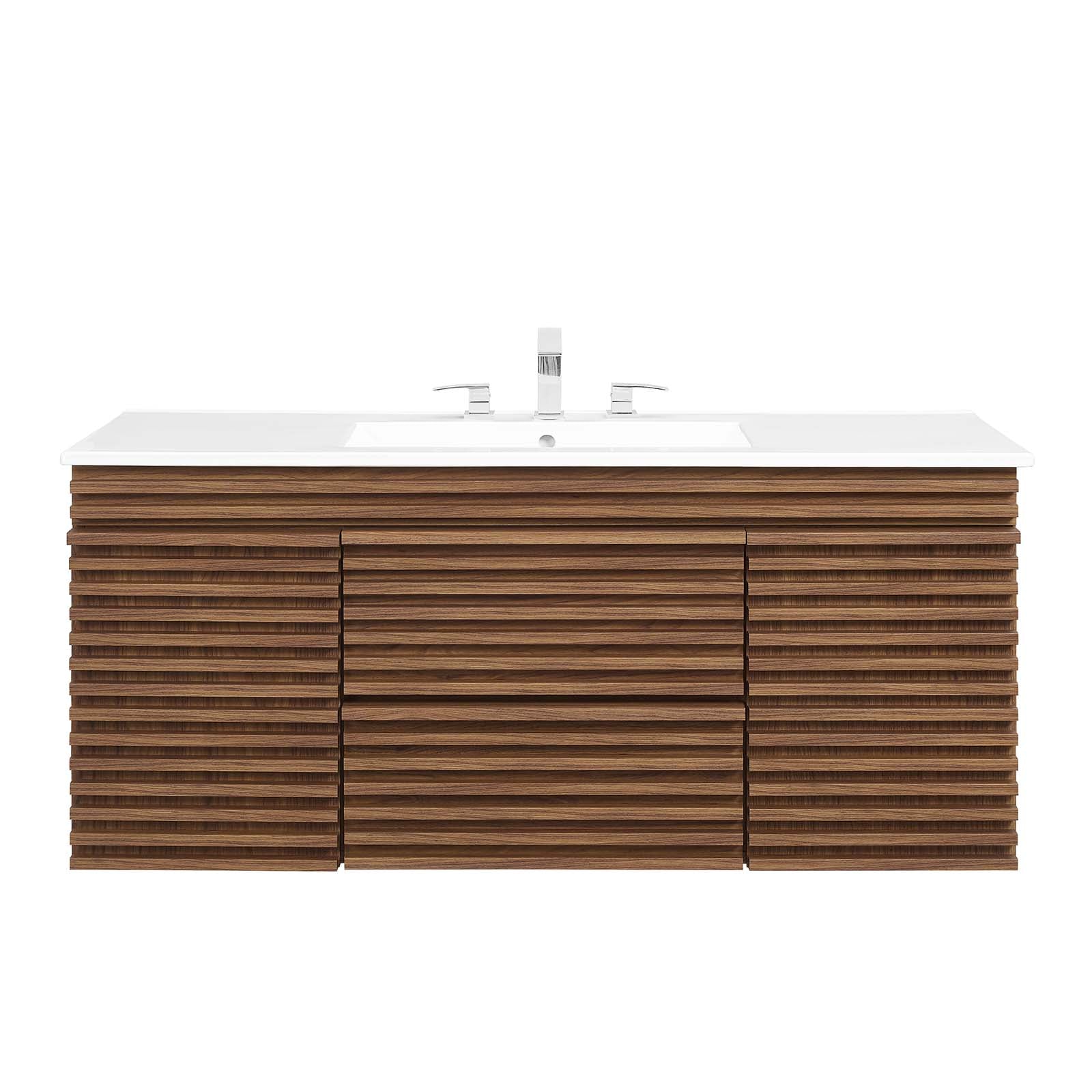 Tap into mid-century aesthetics with the Render Vanity. The Render 48" Single Sink Bathroom Vanity features a durable MDF and particleboard frame with a smooth laminate, ample storage space in two full-extension drawers, adjustable shelves behind soft-close hinged doors, and a space-saving wall-mount design. A curved ceramic basin with an integrated countertop and 8" centerset faucet holes creates sleek lines and a crisp design for an edgy look designed to meet your needs. Boasting a mid-century modern style this vanity features a solid construction with a pleasing look and practical functionality. Assembly required. Fixtures not included. Set Includes: One - 48" Ceramic Basin Top One - 48" Wall-Mount Bathroom Vanity Cabinet