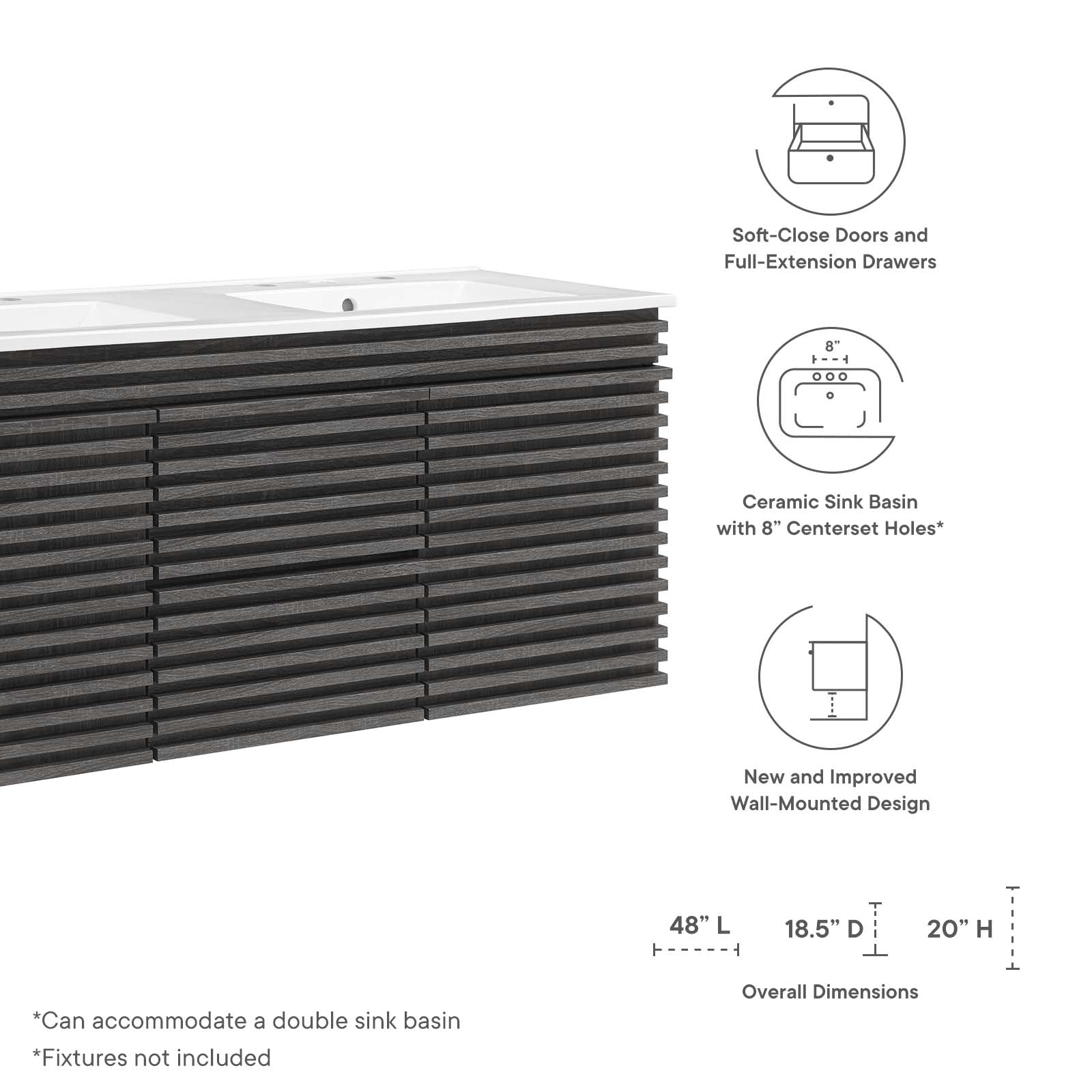 Tap into mid-century aesthetics with the Render Vanity. The Render 48" Double Sink Bathroom Vanity features a durable MDF and particleboard frame with a smooth laminate, ample storage space in two full-extension drawers, adjustable shelves behind soft-close hinged doors, and a space-saving wall-mount design. Two curved ceramic basins with an integrated countertop and 8" centerset faucet holes creates sleek lines and a crisp design for an edgy look designed to meet your needs. Boasting a mid-century modern style this vanity features a solid construction with a pleasing look and practical functionality. Assembly required. Fixtures not included. Set Includes: One - 48" Ceramic Double Basin Top One - 48" Double Wall Mount Vanity Cabinet