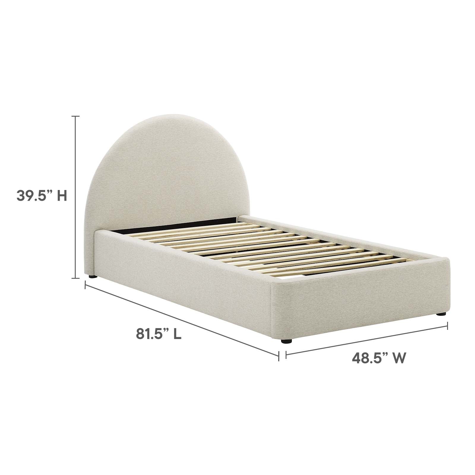 Step into a world of cozy elegance with the Resort twin platform bed. This twin bed features a unique arched headboard that brings a fresh perspective to a guest suite or child's room. Upholstered in woven heathered fabric and cushioned with dense foam, this twin platform bed frame fits various decor styles and offers the luxurious comfort characteristic of a cloud bed. The MDF frame of this kids twin bed, equipped with a wood slat support system, removes the necessity for a box spring. Its solid single bed frame makes the Resort arch shaped round bed great for memory foam, innerspring, latex, and hybrid mattresses, providing sturdy support. Outfitted with LVL legs, each twin bed frame comes with non-marking caps to safeguard your floors, blending strength with a sleek, contemporary appearance. Mattress not included. Assembly required. Bed Frame Twin Size Weight Capacity: 800 lbs. Set Includes: One - Resort Arched Round Twin Platform Bed