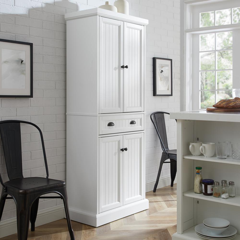 With charming beadboard details, the Shoreline Pantry provides a dash of coastal flair to home organization. Two cabinets with adjustable shelving and a large drawer between them offer storage for a variety of household items. At home in a kitchen, dining room, or common area, the Shoreline Pantry is sure to be a welcome addition to your home.