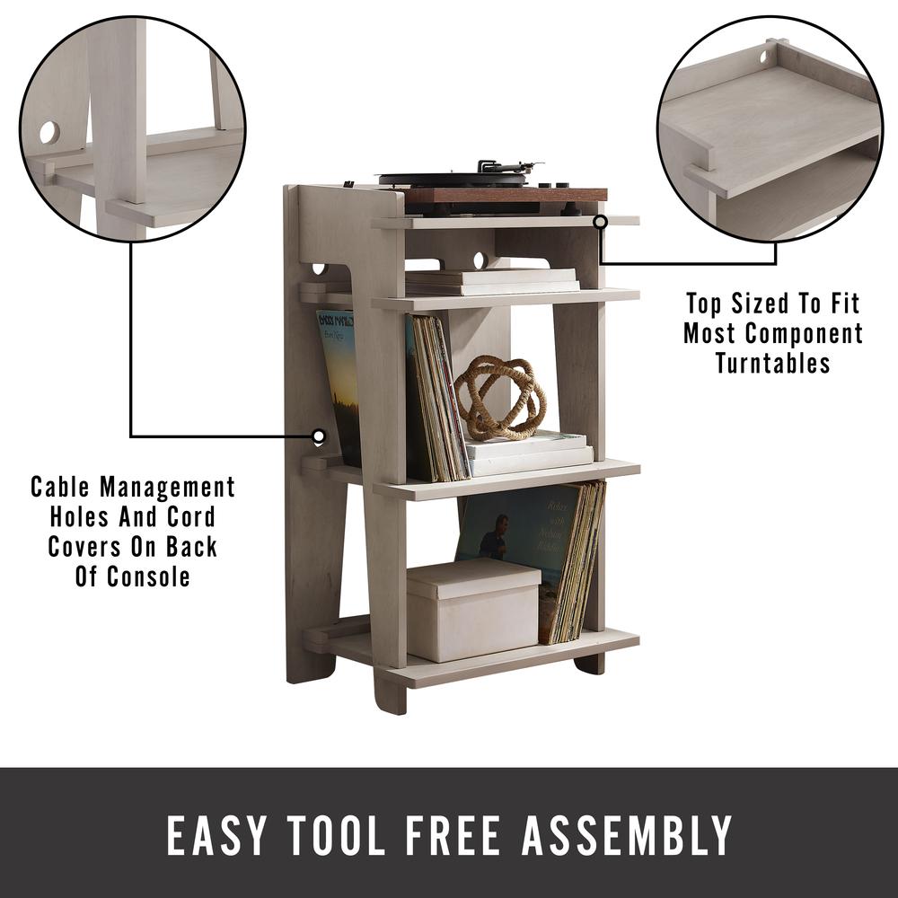 The Soho by Crosley is the music lover's ultimate turntable stand. ÊThe top shelf fits most component-style turntables and features two cable management holes to keep your set up tidy. ÊThe second shelf is perfect for your accessories: preamp, mini amp, cleaning supplies, etc. and features two more cable management holes. ÊThe bottom two shelves can hold up to 100 records each and feature bumpers in the back to ensure that the records sit uniform and are easily accessible. ÊBecause details matter, there are two grooves to display the jacket of the record thatÕs spinning and space under the bottom shelf to keep your records away from the true enemy: dirt and dust. ÊWeÕre confident that the Soho Turntable Stand is the most thoughtful and affordable solution on the market.