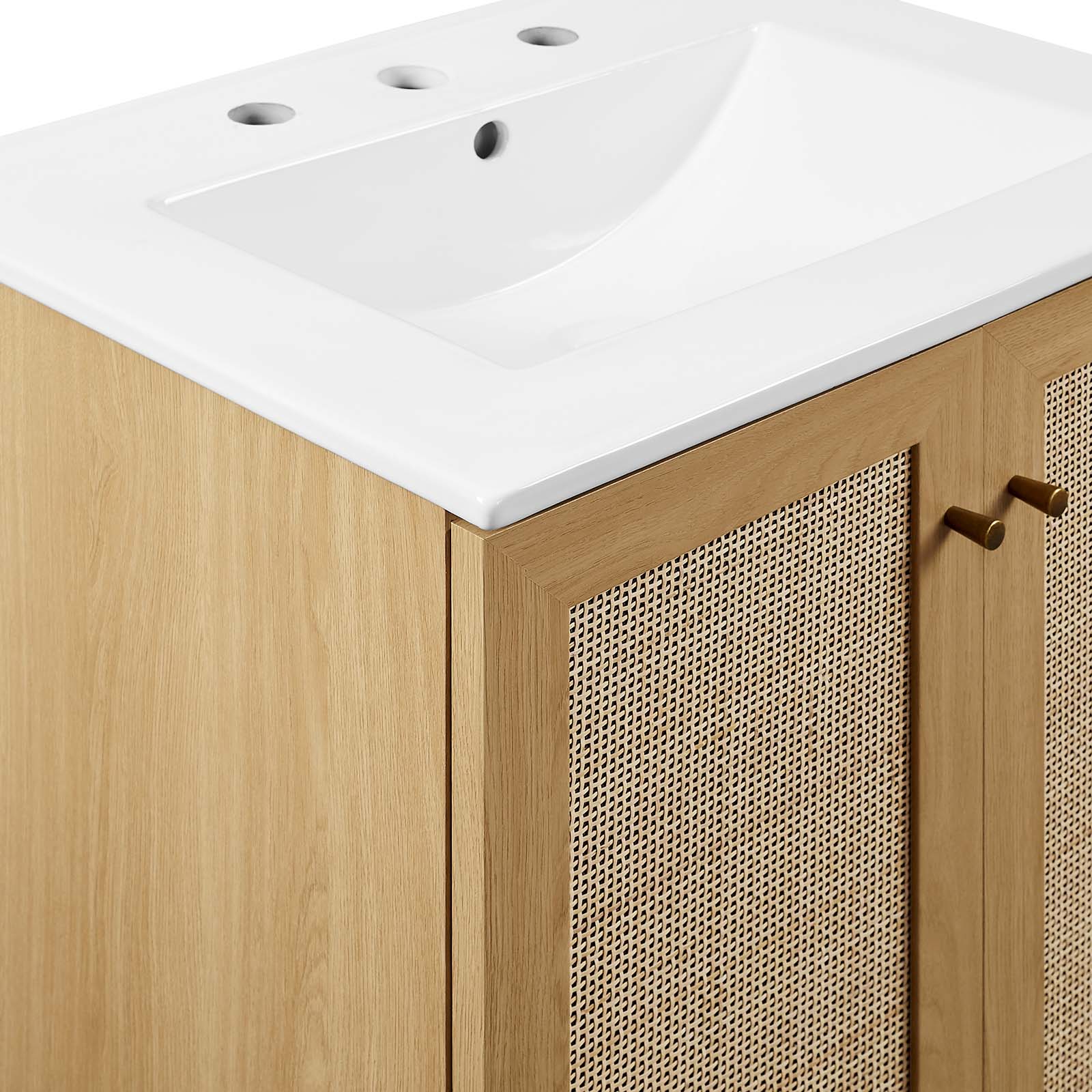 Introduce refreshing style to your restroom with the Soma 24Ó Bathroom Vanity. Showcasing a beautiful rattan weave on the cupboard doors, this vanity brings organic aesthetics and modern functionality to any bathroom or powder room. Crafted from durable MDF and particleboard with a natural wood grain finish, this vanity boasts a ceramic sink basin with 8-inch centerset holes and an integrated countertop. This vanity features an adjustable shelf, providing easy customization for arranging towels, toiletries, and bathroom necessities. Complete with metal doorknobs with a brushed gold finish and soft-close hinges, this bathroom vanity cabinet is designed for quiet and effortless functionality. Resting on splayed legs, the Soma Bathroom Vanity includes non-marking foot caps to protect flooring. Assembly required. Fixtures not included. Set Includes: One - Cayman 24" Bathroom Sink One - Soma 24Ó Bathroom Vanity Cabinet (Sink Basin Not Included)