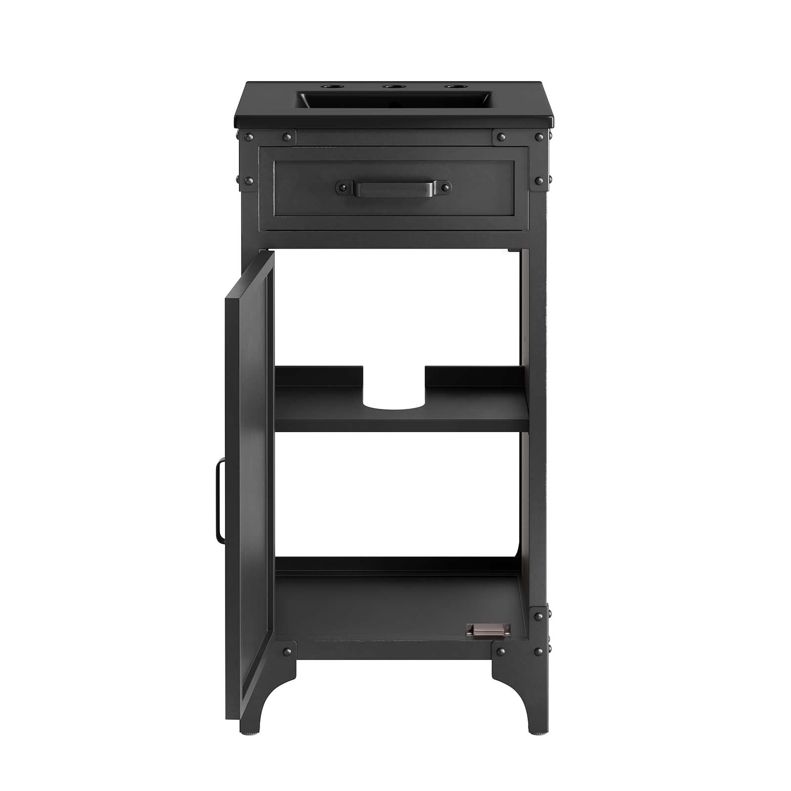 Experience the perfect blend of functionality and industrial modern style with the Steamforge 18" Bathroom Vanity. Crafted from sturdy metal with an antique patina and MDF with a beautiful wood grain veneer, this bathroom vanity cabinet brings a touch of utilitarian elegance to your bathroom decor. With a fixed drawer, pivot hinges, and spacious shelving complete with a plumbing cutout, this vanity provides ample storage space for all your bathroom essentials. The ceramic sink basin boasts an integrated countertop with 8" centerset holes, ready for your chosen fixtures (not included). With non-marking foot pads to protect your flooring, this bathroom vanity offers the ideal balance of design and practicality. Set Includes: One - Cayman 18" Bathroom Sink One - Steamforge 18" Bathroom Vanity Cabinet