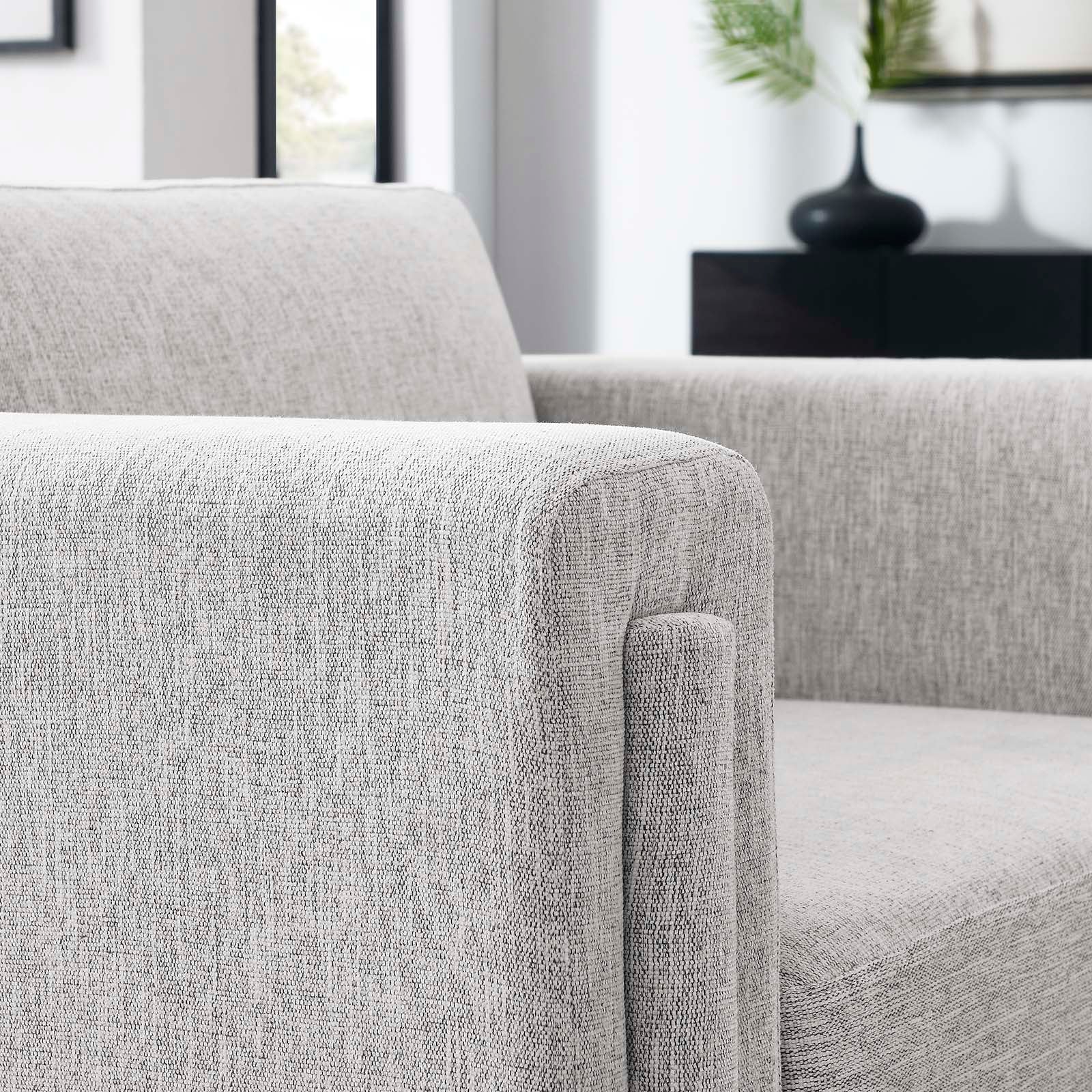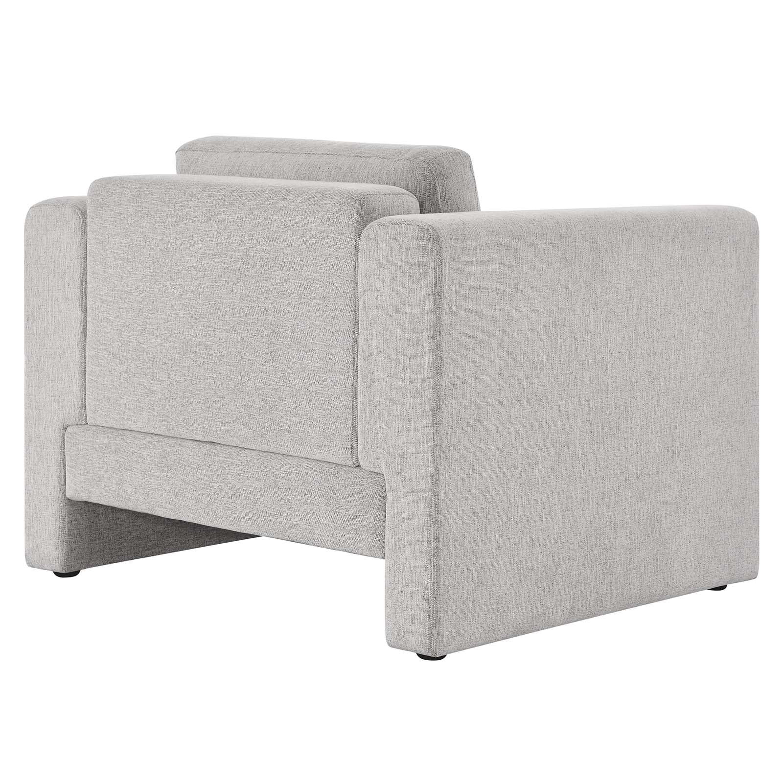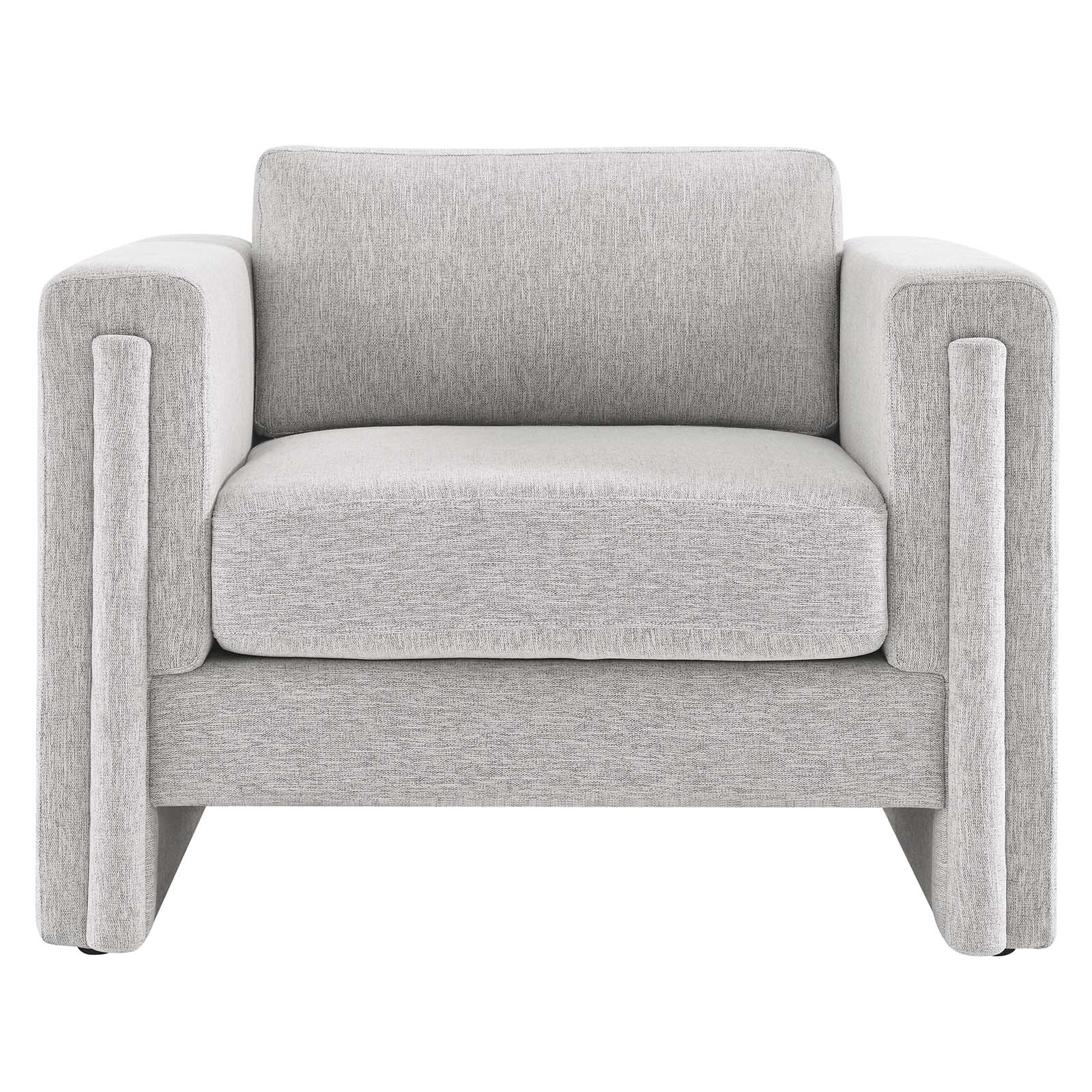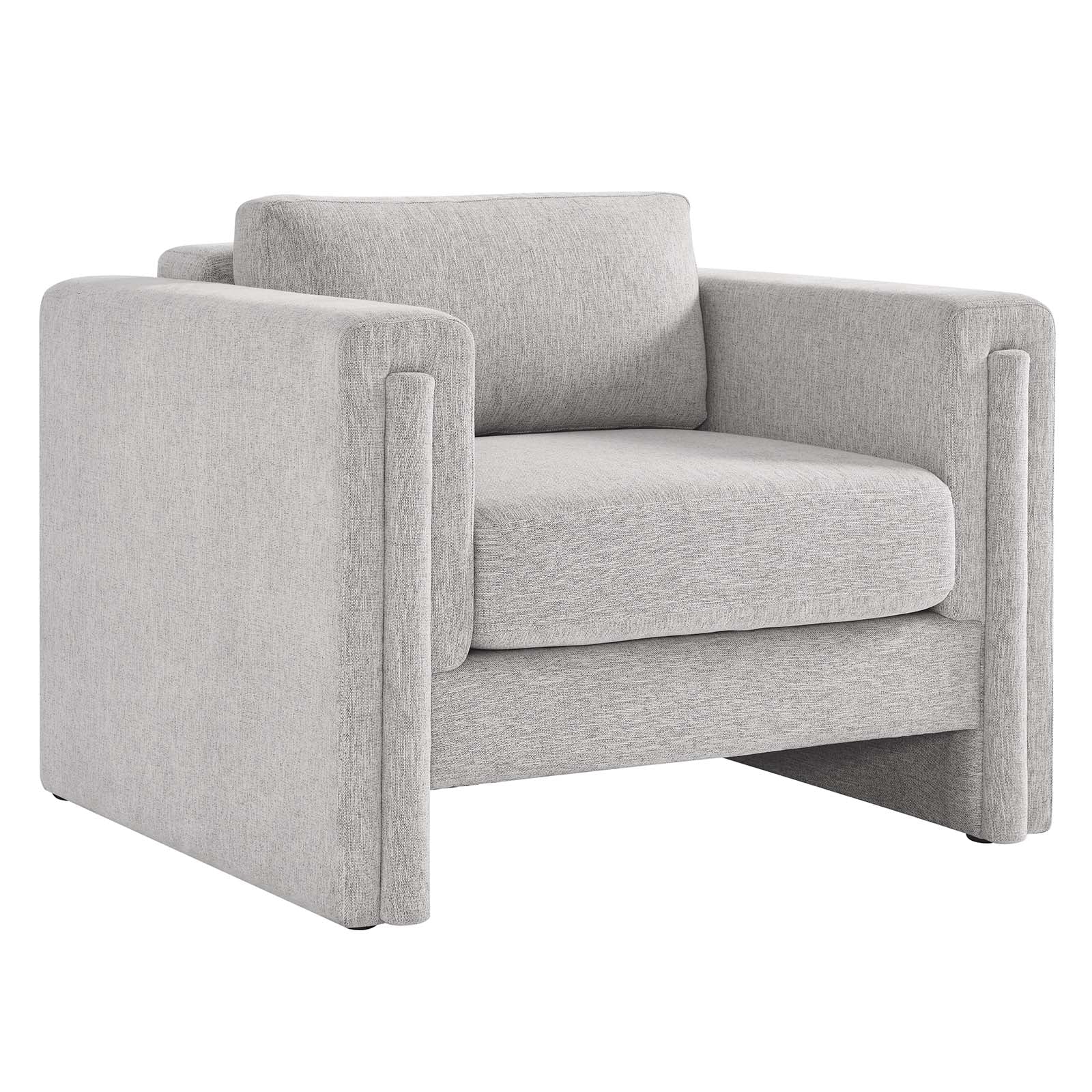 Indulge in the epitome of modern luxury and sophistication with the Visible Accent Armchair. Crafted with a sturdy wood and plywood frame, this armchair exudes modern elegance with its sleek lines and tailored silhouette. The adjustable non-marking foot pads protect your flooring while providing sturdy stability. Sink into cozy comfort with the dense foam padding, individualized pocket coil support, and stain-resistant heathered weave polyester fabric upholstery. The cushions and cushion covers are removable. Enjoy unmatched support with the pocket coil springs that offer a premium seating experience. Assembly is required with easy to follow assembly instructions. Weight Capacity: 330 lbs. Set Includes: One - Armchair