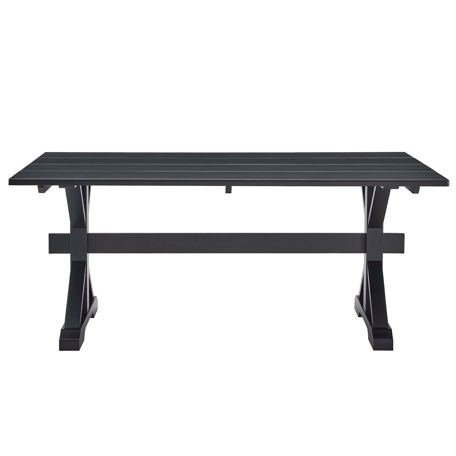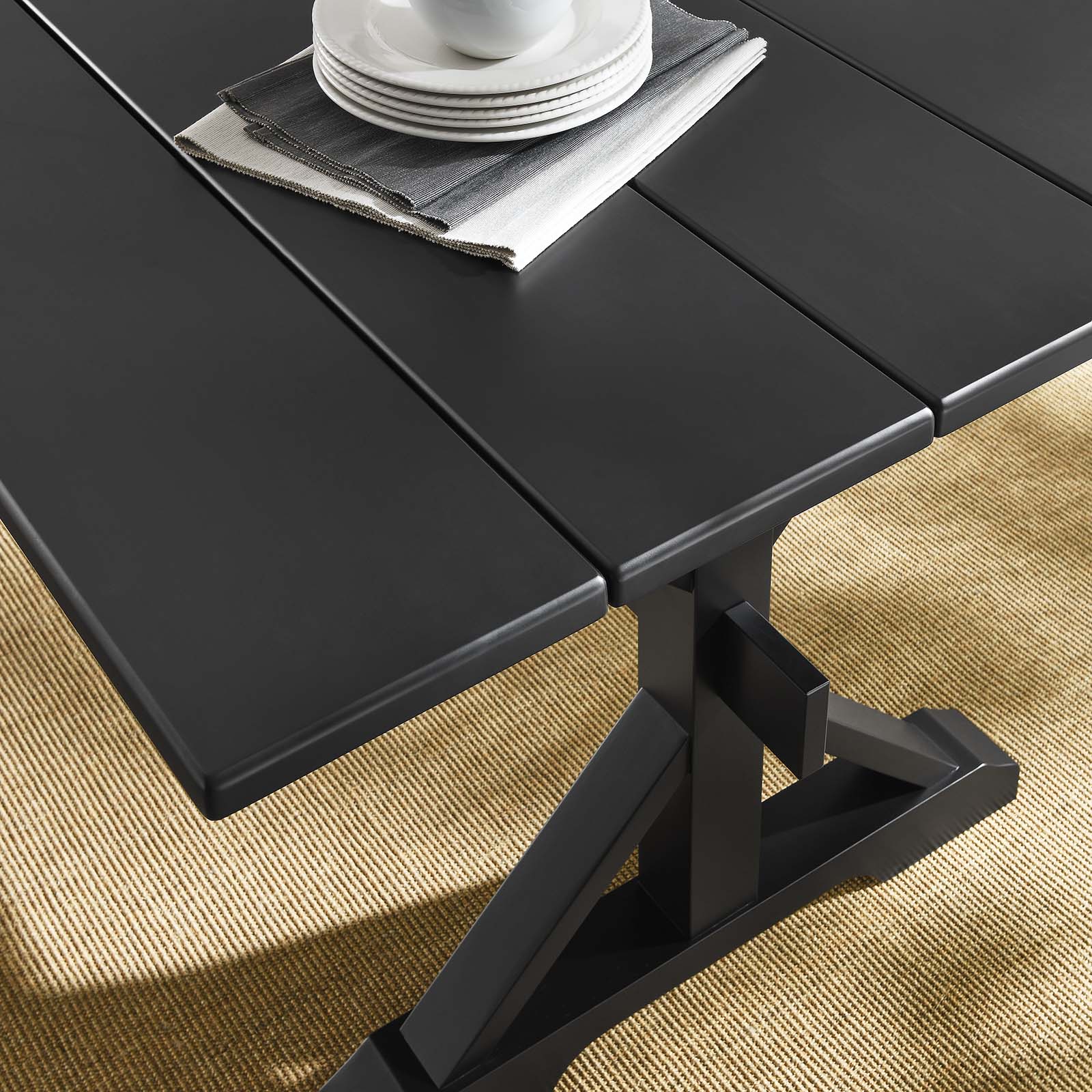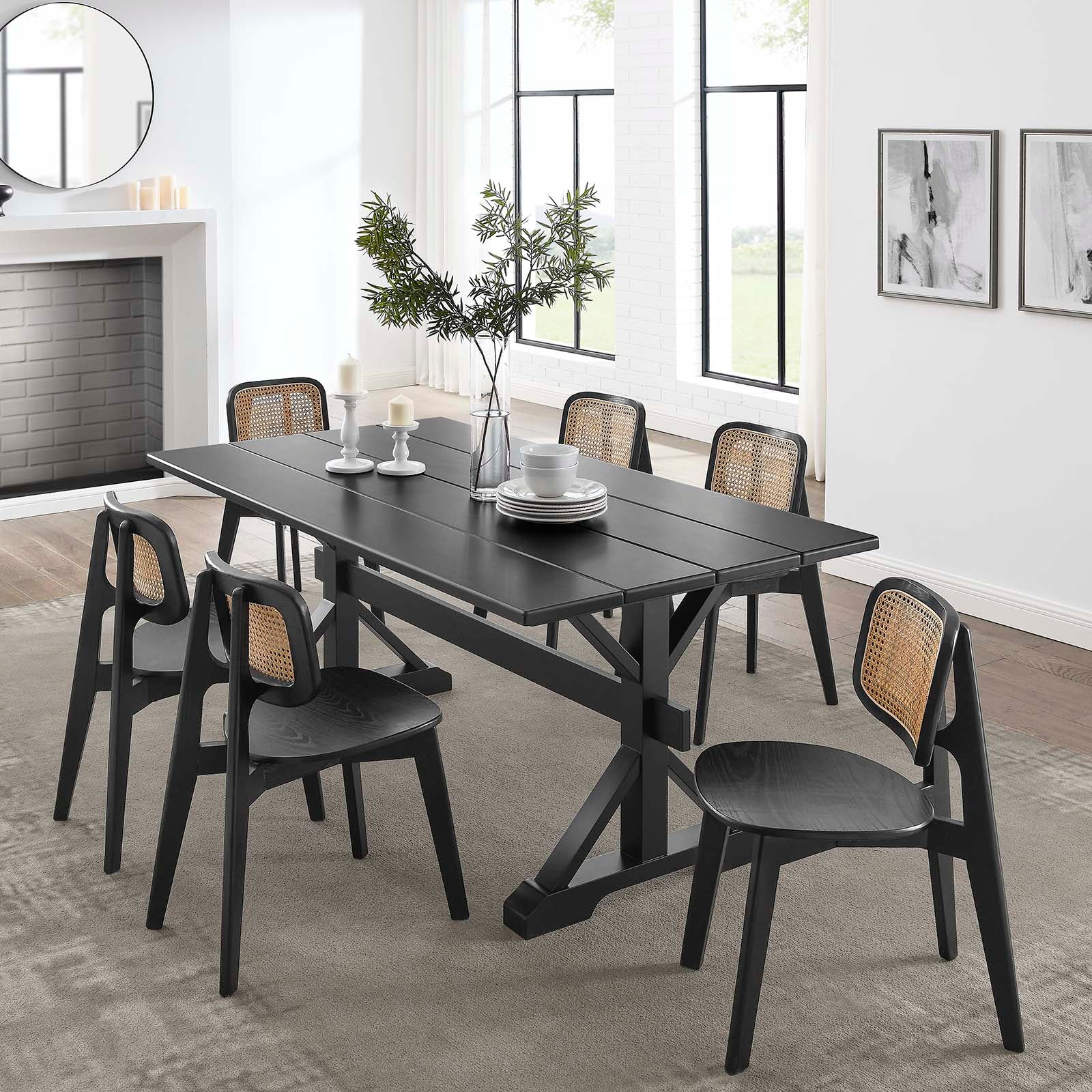 Bring the warmth of the countryside into your dining room with the Windchime 71" Wood Dining Table. Crafted from solid wood and wood veneer, this sturdy trestle table stands 71 inches long, seating 6 to 8 dining chairs comfortably. The natural wood grain elevates the charm, while the trestle base adds a rustic design element. Ideal for both intimate dinners and entertaining family and friends, this wood dining table effortlessly blends farmhouse charm with modern appeal, making it a must-have centerpiece for your home. Simple assembly required. Includes adjustable levelers for added stability and to protect flooring. Weight Capacity: 740 lbs. Set Includes: One - Windchime 71" Dining Table